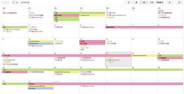 離職的三十天以來,雖然不用固定每天上班打卡、不用被關在小會議室裡面開長達四到六小時的動腦會議、不用勞心勞力的高雄台中一日閃電出差,但我也覺得自己的schedule好像也有點滿,上圖是我和老大的交叉行事曆,故意搞得花俏得哩。紅色是我滴、綠色是老大滴(自以為在拍屈臣氏廣告)、黃色是台灣的重要節日、藍色是美國的重要節日。
