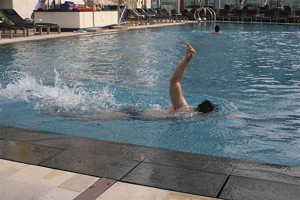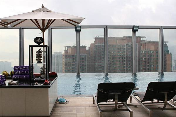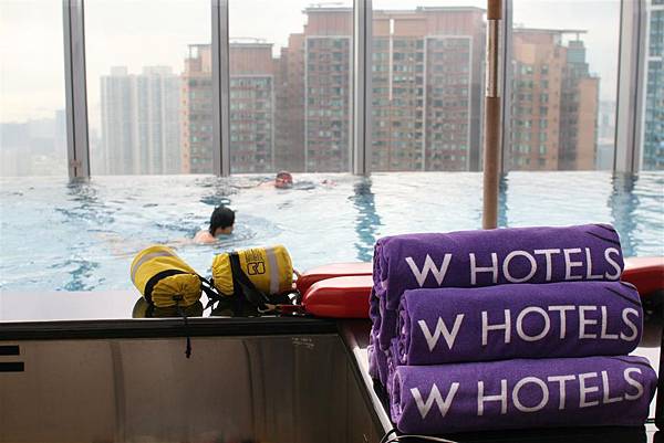 網路上其實已經有很多關於香港W的外觀和房間照片,我想我就可以跳過不用特別介紹了。對於平常只有機會體驗位在B1的大安運動中心游泳池的我,反倒是在高達76樓的游泳池我可還是生平第一次嘗試,可以俯瞰九龍城,讓我很有興趣。