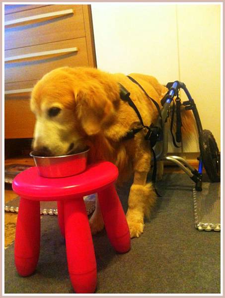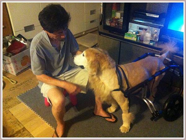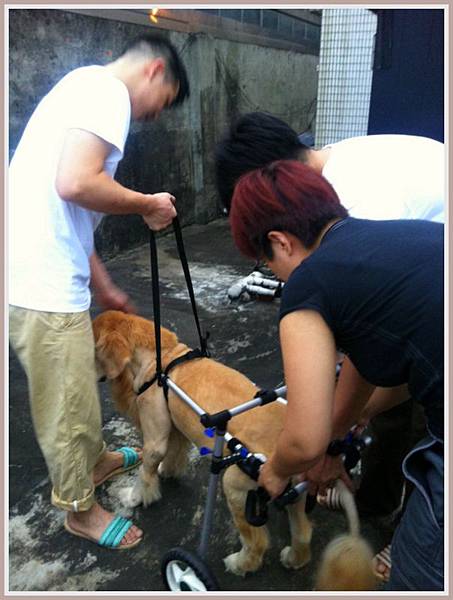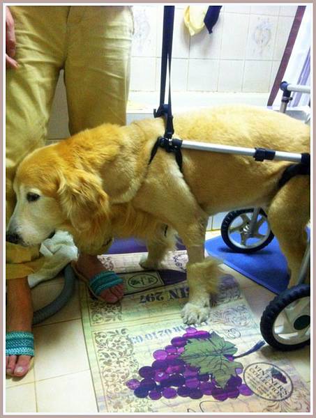 剛才又成功一技,讓他自己用輪椅在陽台上噓噓了。下一技就要挑戰便便了,好險他主人今天就出國回來了,我有訓練到可以交棒了。