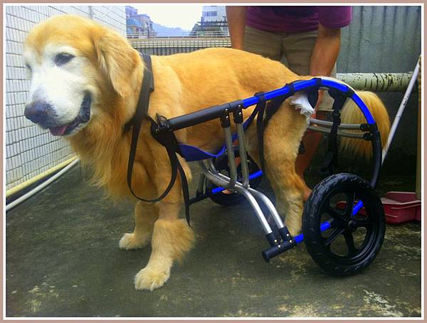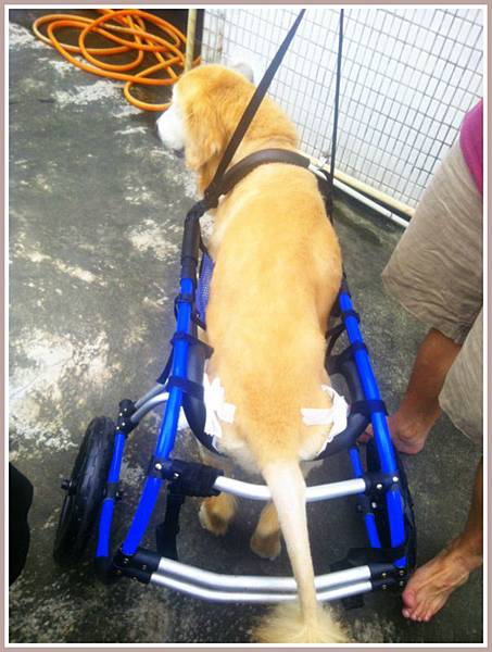 新坐騎阿藍到了,後腳是跨坐在橡膠圈內,胸腹部用彈性的pu布撐住,幫他減輕一些身體的重量