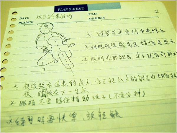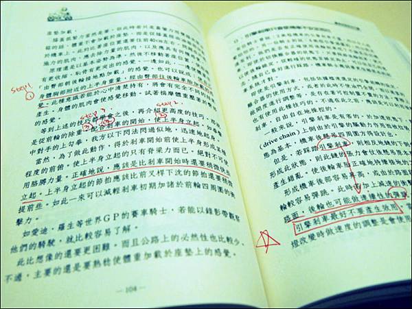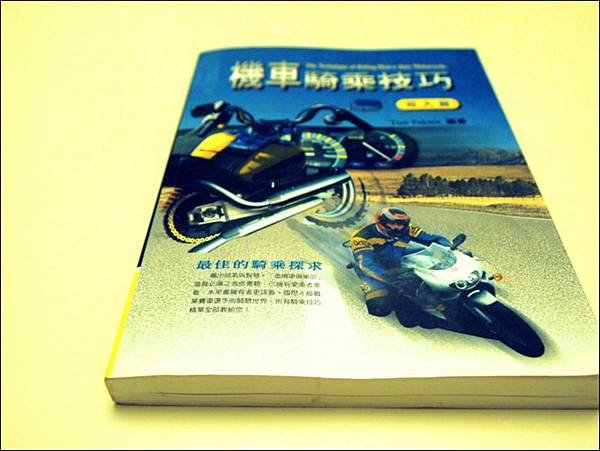 不過,老大的重機知識與技巧絕不是只是翻翻流行雜誌就可獲得。所謂「工欲善其事必先利其器」,老大秉持著處女座腳踏實地、一步一腳印在重機界耕耘,其實他也有下點苦功的。噹啷~居然在我家書櫃上翻出這麼一本副有知識性的工具書《機車騎乘技巧》 。