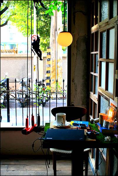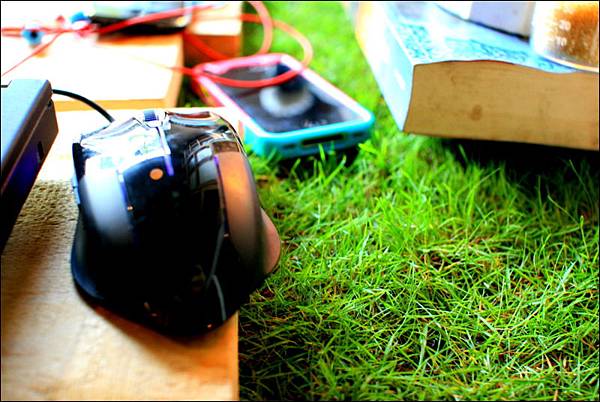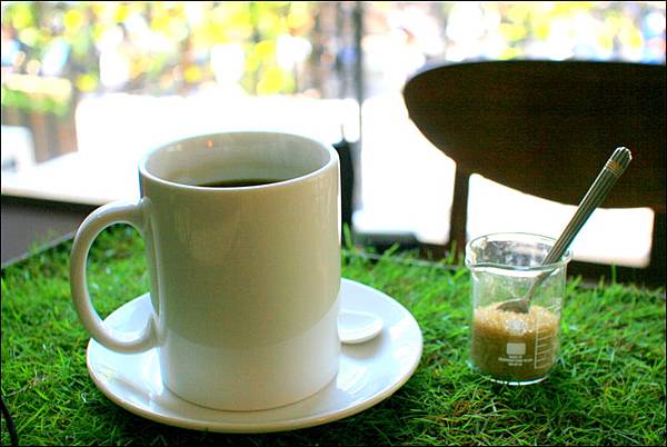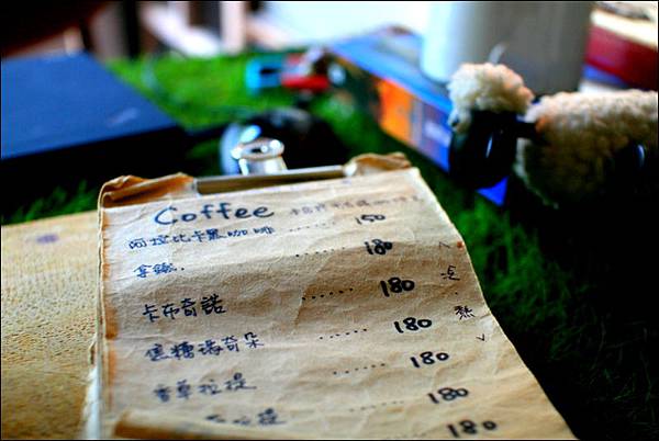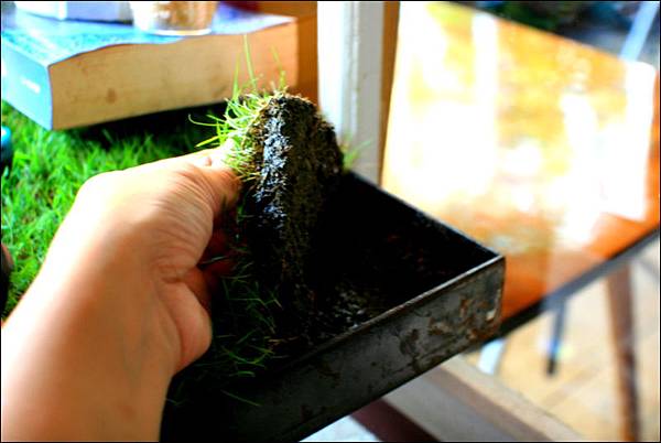 因為接近客滿的狀態,又需要插頭,所以就被安排了一個讓我很詫異的座位「我的桌面是一片綠油油的草皮!!!!」當時我還為了要確認這草皮是真是假,就一直到處東摸摸西摸摸,直到翻開草皮,「靠,是溼答答的泥土,而且還有蠕動中的小蟲!」我默默蓋上草皮,心想著希望不要因為剛才在草皮上打翻的一堆砂糖而為此店引來成群的螞蟻。I am 搜哩~~