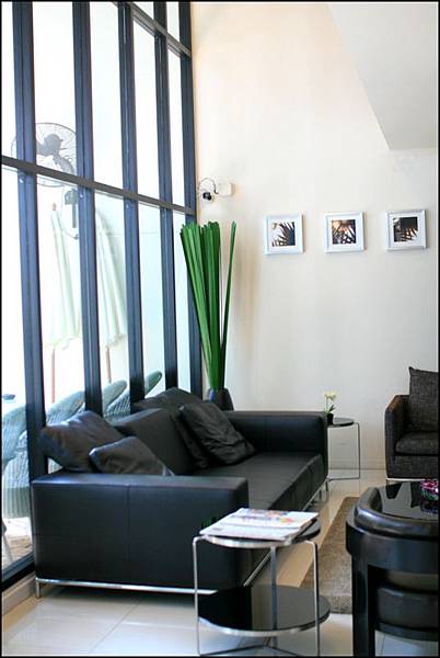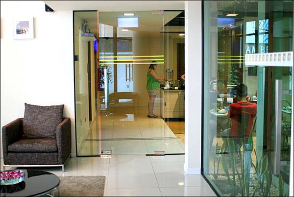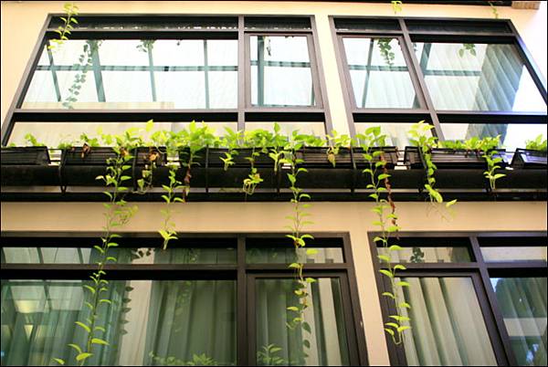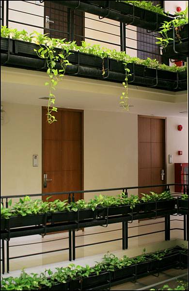 我個人最喜歡這塊綠油油的設計,若不是綠葉的點綴,其實這些水泥牆就和我們一間又一間台北市華廈住宅沒兩樣,可是卻因為綠葉給了這裡生氣,加上採光非常透亮,好像是在鋼筋水泥商業區意外闖進的小綠洲。