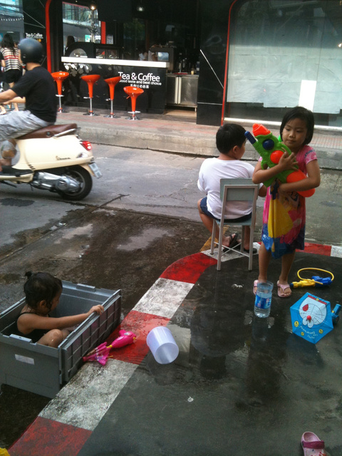 以往,潑水節的開始,通常也是泰國的熱季開始,玩水是小時後夏天解暑的最佳方法,到了曼谷的第一天,就是潑水節的第一天。孩子已經自己玩得很嗨了,任何可以裝水的容器絕不放過,甚至有了桶子就開起游泳池了。