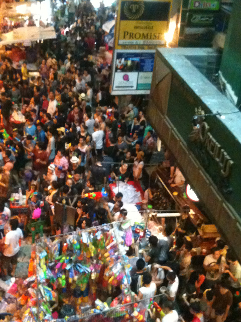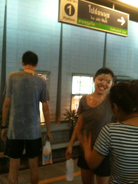 一到了捷運站出口從二樓往下望,卻驚覺這個戰場真是可怕,首先是捷運站出入口算是已經積滿了水,因為有裝水的水槍不可以帶進捷運上,所以大家拼命把水槍裡的水在出口處消耗掉,再來,樓下封街的人潮也太過洶湧了吧,我已經對於這種人擠人的活動告老還鄉很多年了,想不到這把年紀我居然來曼谷跟人家湊熱鬧,心裡坦白說有點開始小緊張。