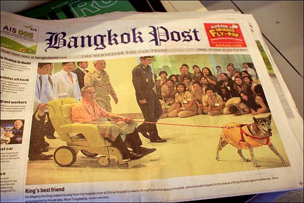 還順便看了一份Bangkok Time,那天的新聞頭條正好是身體微恙的泰皇出院,前面領隊的是他的愛犬。